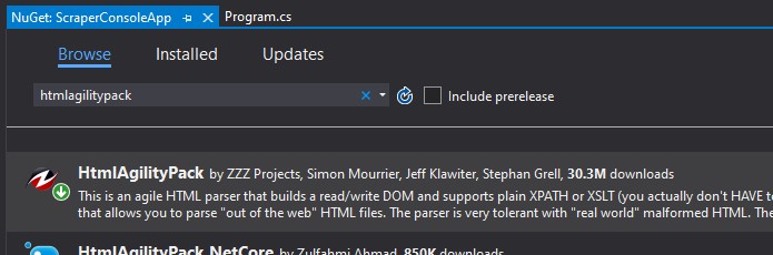 In terms of parsing the data to get it into these objects we’ll need to trawl the text. There are a few ways we can do this such as Regex however to make it simpler we’ll take to Nuget and install the HtmlAgilityPack to do all this leg work for us: