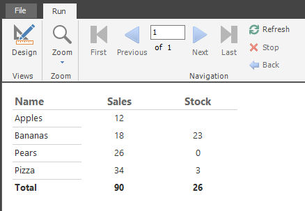 I’d expect you’ll be using more realistic data than what I’m doing here, but thought it was worth noting for later that we don’t have Apples in stock, and nobody is buying Avocados. With all of that in place we’re able to add a new field into the tablix and add an expression to present the stock quantity: