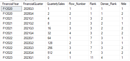 One of the popular and more straight forward uses of window functions is for ranking records based on a certain order. Let’s see about how we could use a window function to assign a row number to each record in the table based on the order of the quarters: