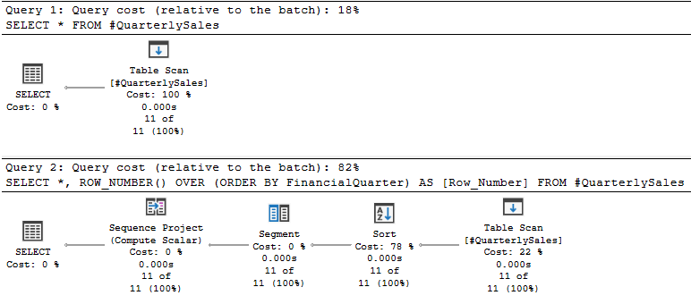 I thought it was worth taking a moment to see how these window functions manifest themselves into the execution plan. As with most features it isn’t free to be using these in a query and you’ll see some additional operators in your query plan. Here’s a comparison showing a regular query against our table versus one where we’re using a window function: