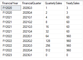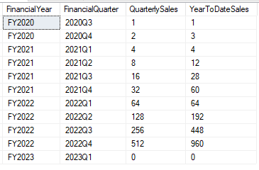 When we looked at the ranking functions the ordering was key in their results and was therefore mandatory. This isn’t the case with the aggregates, however using an ORDER BY can bring some benefits – let’s see what that looks like. We’ll try the same thing again but this time we’ll specify the ordering to be based on the quarter to see what that changes: