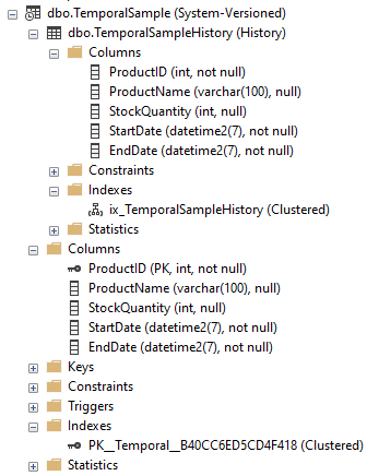 In addition to seeing this in the metadata we will also see the icon change within Object Explorer too and expanding the node for the table will show the history table nested under it. We can expand the history table like a regular one to see the contents of that too such as the columns and indexes. Below is how the columns and indexes compare between our two tables: