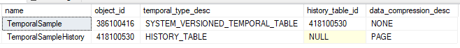 You can see here that the engine knows which is the temporal one and is linked to the other table which is marked as the history. You’ll also see that the compression for the history table is set to PAGE which is the default for any history tables when they are created.