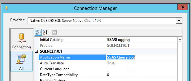 When we find this entry we can select the field under the Value column a small button will appear there to allow us to configure that connection. Within the dialog which pops up we’re now looking for the Application Name property which you can finder under the provider node: