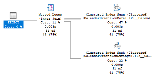 As we saw with the index scanning the core table only requires a fraction of the reads – 427 in this case, and then a further 103 reads to perform the Seek operations into the string data. Again an impressive saving of 70%. There will be some additional processing overhead due to our join operation, the amount of which would depend on the volumes of data needing to be joined.