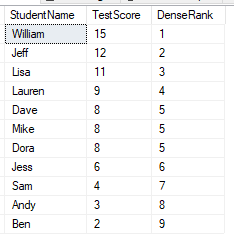 The output is similar to the RANK function, and the tie for fifth place still exists. Where this differs is that the sequence will be consecutive so won’t skip any ranking values – here we see the next record after the tie for rank 5 is rank 6.
