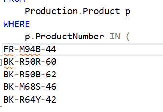 Let’s look at a slightly larger example which can be quite common. We’ve got a list of values and want to perform an IN clause. Why don’t we format all of those values at the same time?