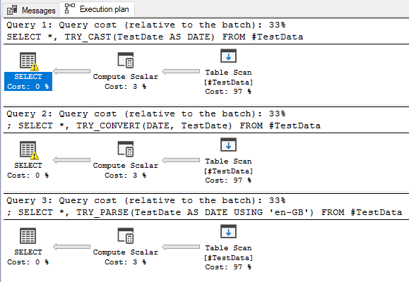 The execution plans looks the same as we saw previously but they’re not telling the full story. It’s worth noting that the elapsed time for the TRY_CAST and TRY_CONVERT functions is primarily from returning the data back to Management Studio.