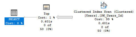 This index won’t help us to execute this query, but it gives the engine an alternative. The plan may look the same as our TOP 50 previously but not it’s fully optimised. The choice was easy but it was available. It was a better option than this mess: