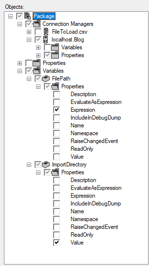 AND c.PackagePath = '\Package.Variables[User::ImportDirectory].Properties[Value]'