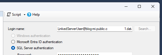 The Managed Instance doesn’t like our credentials, no account matches. So we’re going to create a new login on the Managed Instance. Including the server name. Let’s call it a fully qualified login: