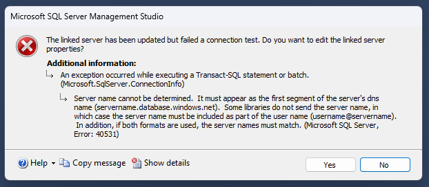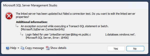 The Managed Instance doesn’t like our credentials, no account matches. So we’re going to create a new login on the Managed Instance. Including the server name. Let’s call it a fully qualified login: