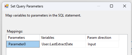 We have the LastExtractDate variable used for a parameter in the query to retrieve the data: