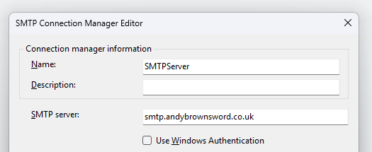 VALUES ('Common', 'smtp.andybrownsword.co.uk', '\Package.Connections[SMTPServer].Properties[SmtpServer]', 'String');