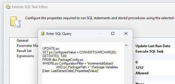 While most configuration may be static, there are situations where we might want to modify the values. For example when performing an incremental extract we may want to record a LastExtractDate which is updated at the end of the package.