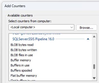 Performance Monitor has a number of counters available for SSIS. These can be found under the category ‘SQLServer:SSIS Pipeline [Version]’: