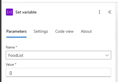 To start the loop we have a couple of housekeeping bits we need to do. Firstly use a Set variable action to clear the array variable so each record starts fresh: