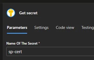The authentication is based on the certificate so we need to grab that from the Key Vault. Using the ‘Get secret’ action we can connect to the Key Vault and retrieve our certificate (as a base-64 string):