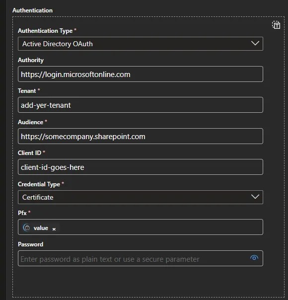For the authentication (which is what we’re here for), we can use Active Directory OAuth to authenticate the App Registration. Set the Tenant, Audience, and Client ID appropriately, and then select the Credential Type as Certificate. The value attribute from the Get Secret action (which contains the certificate from the Key Vault) can then be used in the Pfx field to authenticate:
