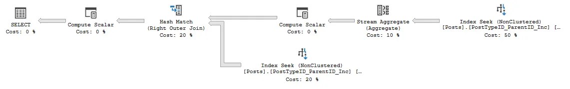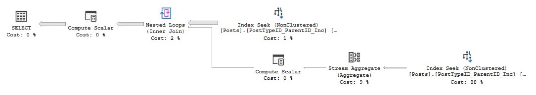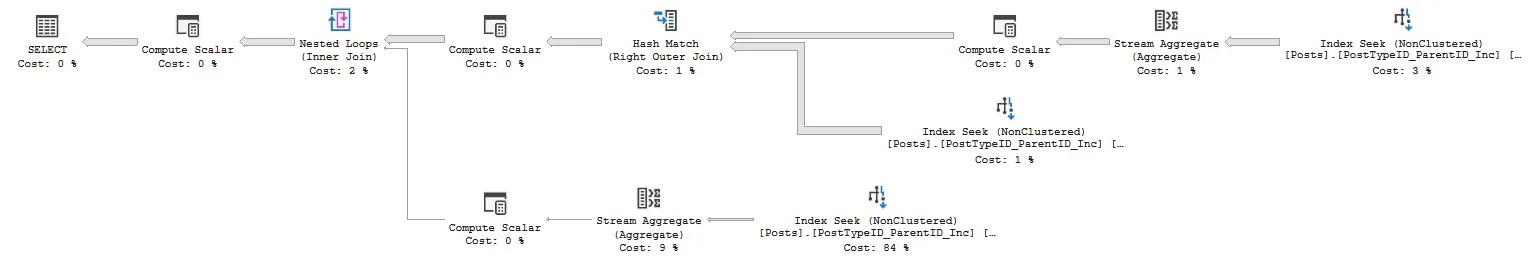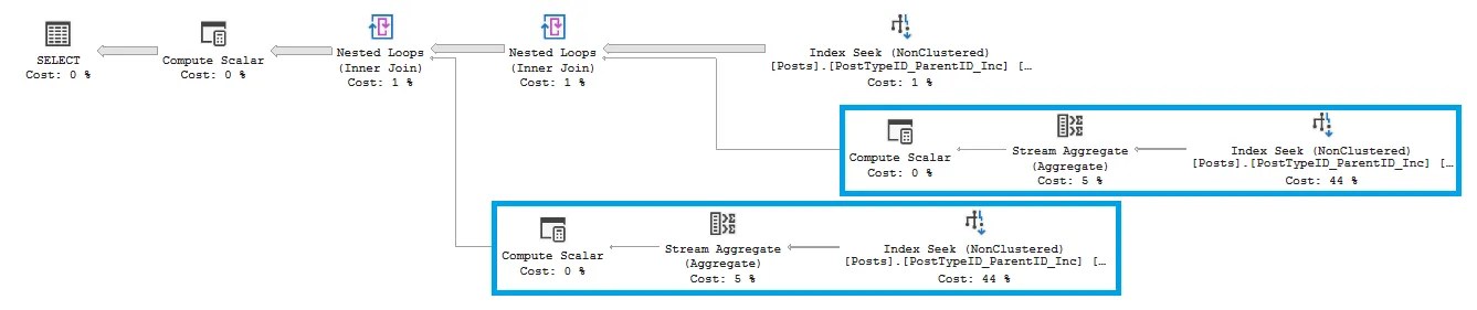 In our example it’s not dangerous as we know that AnswerCount will always be populated, so this doesn’t impact the reads. However, if we remove the AnswerCount and need to evaluate the subquery (twice):