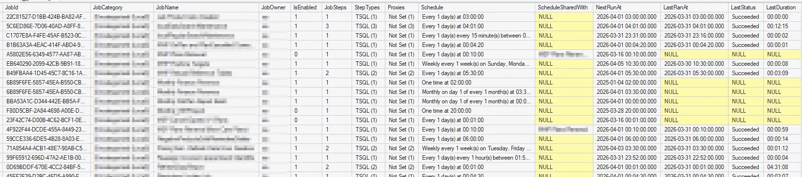 Note the script uses the STRING_AGG function. If you’re running anything prior to SQL Server 2017, switch to FOR XML PATH instead (or ask your AI companion to). Also if you have a lot of jobs or frequent execution, you might have active schedules but the last execution is missing from the history (like the monthly schedules above) – keep an eye out for that false indicator they’re not used.